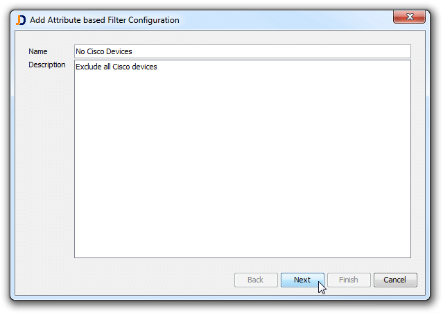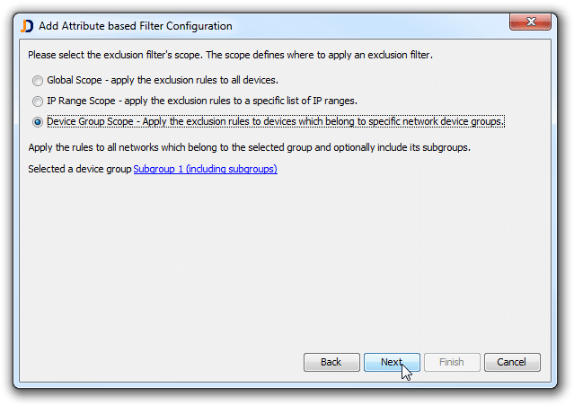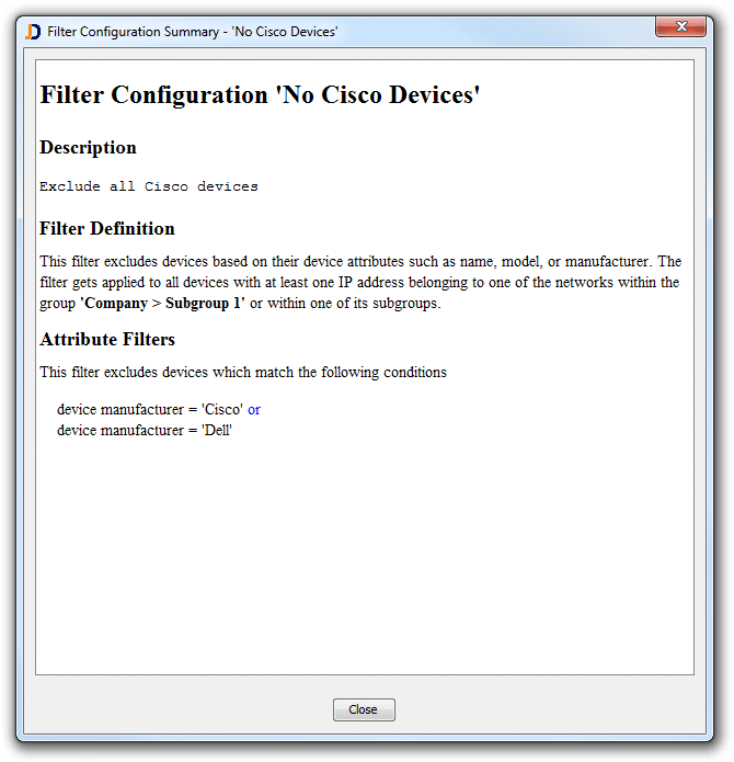 The last step within the wizard defines the attributes to filter on. It is possible to add multiple filters for a specific attribute. When you – for instance – define “Cisco” and “Dell” as filters for manufacturers, then the filter excludes all devices from either Cisco or Dell. When you define additional attributes – for instance – the device type, then you exclude all devices of a specific type which have “Cisco” or “Dell” as manufacturers.