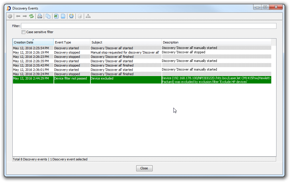 It can be somehow difficult to find the reason why a device does not appear in JDisc Discovery. In order to simplify filter troubleshooting, JDisc Discovery creates a filter event whenever it excludes a device because it matches a filter criteria.