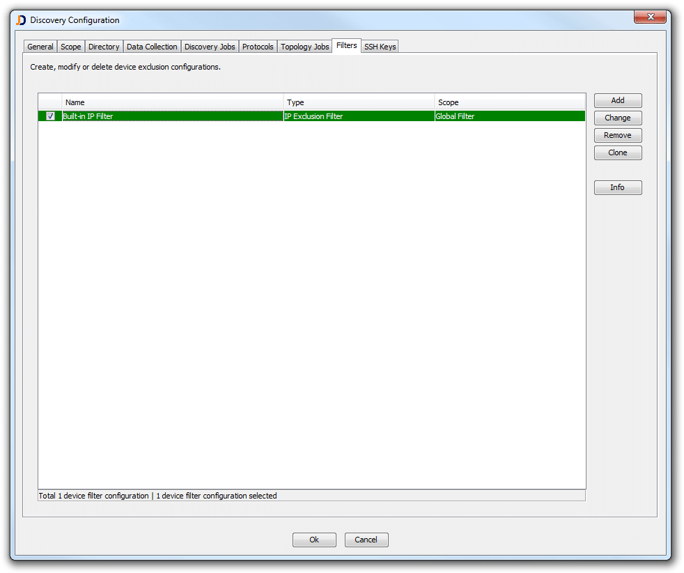 So let’s check out what the new filtering mechanism looks like. The filtering configuration is located within the discovery configuration dialog. Open the discovery configuration dialog and select the Filters tab. The filters tab displays the list of filter configurations. Initially, there is exactly one filter configuration: “Built-in IP Filter”. This is a built in filter which is used to hold the list of excluded devices (remember, you can select the option “Delete and exclude device” when deleting devices). This filter can’t be deleted, but you might modify the list of exclusion ranges or excluded devices.