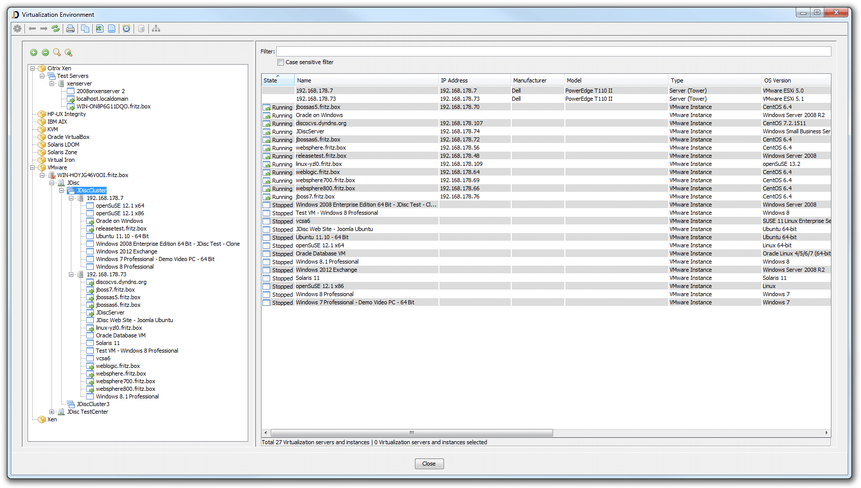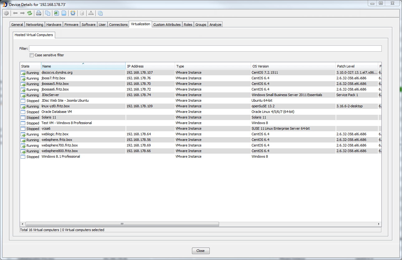 JDisc Discovery now also determines the list of virtual machines which are not running. We have implemented this feature first for VMware and Citrix XenServer. The remaining virtualization technologies will be added over time. The virtual machine list for ESX servers has a new column called state. The state reflects the state of the discovery at the ESX server’s discovery time. However, if we later find out that a stopped VM can be actively pinged and discovered, then we change the state to “running” because it is obviously running.