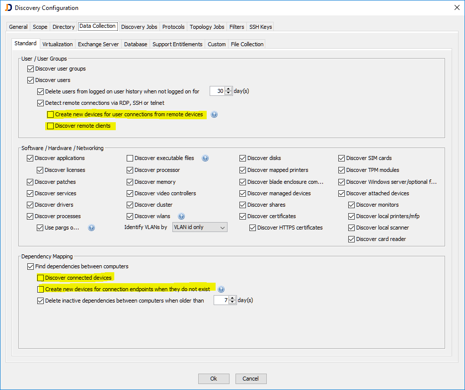 Disable the marked options in order to avoid scanning related devices. The Dependency Mapping section is only available if the Dependency Mapping Add-On is installed.