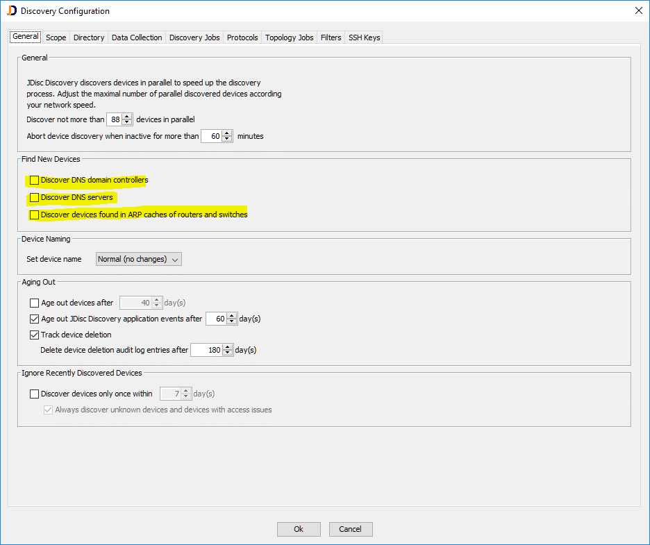 The general settings tab includes some options about how to deal with domain or dns servers found when scanning a device. Disable the marked options in order to disable scanning DNS server or domain controllers as they are identified when scanning a server.
