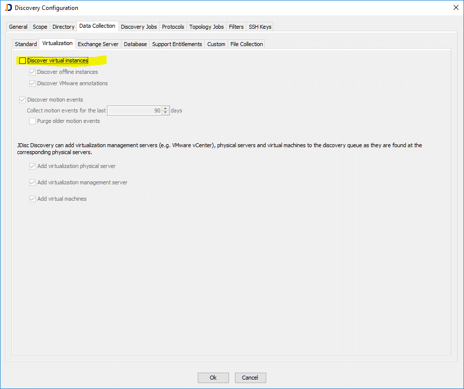 The virtualization tab has many settings about how to scan virtual environments. Remember, that we can get information about all ESX servers and virtual machines when scanning the VCenter installation. The ESX servers or virtual machines might be outside the configured networks. And also keep in mind, that you will not get the relationships between the VCenter, the ESX servers and the VMs when you disable this option!