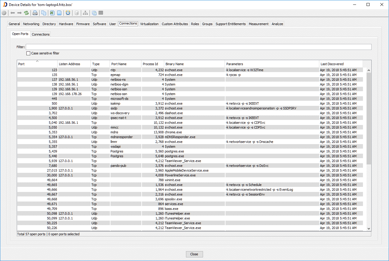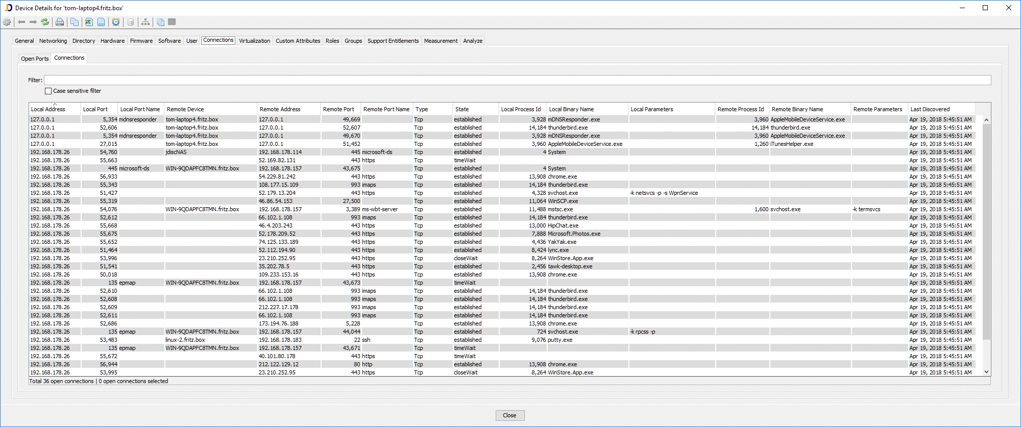 our Dependency Mapping Add-On can determine the list of open TCP/UDP ports together with the TCP/IP connections. For quite a while, we had the idea to be more precise on the TCP/UDP ports and connections. Right now, we can get the information that there is a communication between device ‘A’ on port 55234 to another device ‘B’ on port 22. After discussions with customers, they also requested to get the IP addresses that are part of the communications. Especially for firewall rules, it is important to know what network interface (IP address) a process is listening on. So we added both: