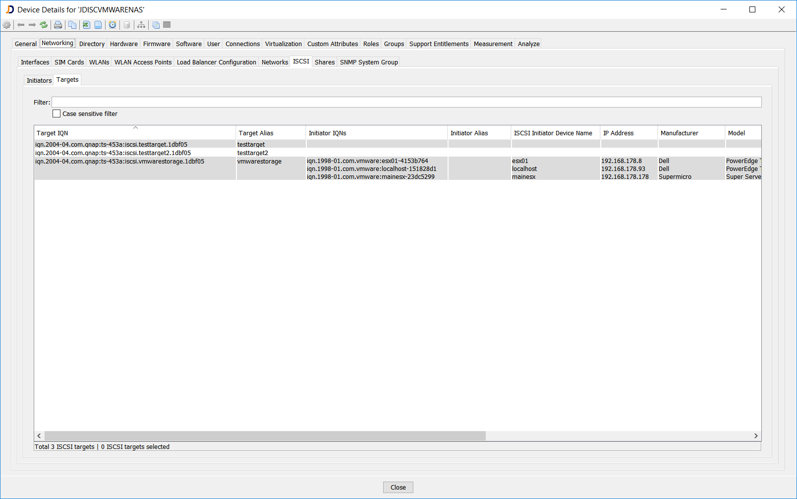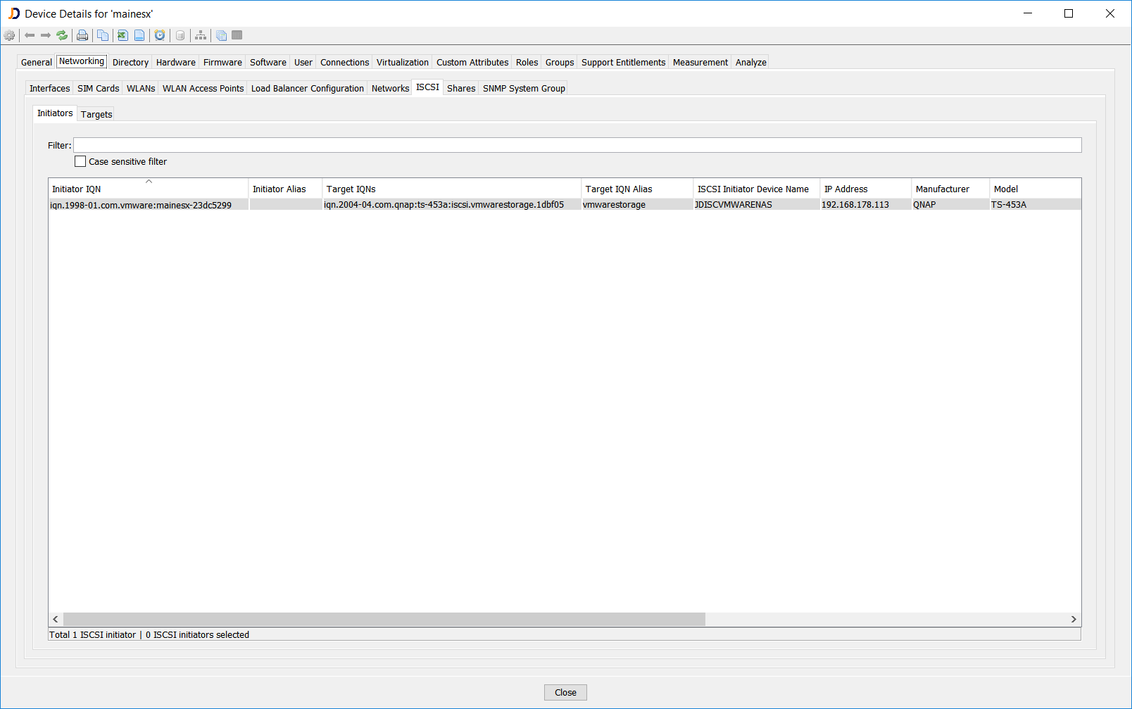 The device details dialog provides a new tab ISCSI within the Networking section. The ISCSI tab includes two subsections. One for the ISCSI initiators and one for the ISCSI targets. Besides the IQN and alias, the report also includes the connection sessions.