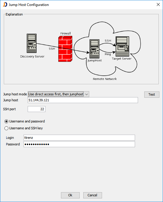 Click on the Test button in order to test access to the jumphost. Once the jumphost is configured, the discovery connects first to the jumphost and performs pings from the jumphost to the target network. When scanning devices within a network with a configured jumphost, we connect first to the jumphost and then open from there a SSH to the target computer.