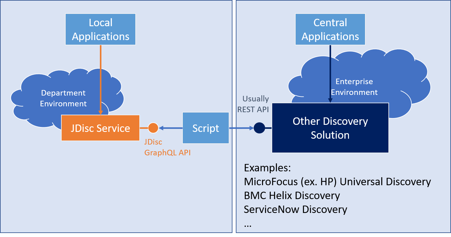 Well, mostly the enterprise discovery solution will have some API available, mostly probably a larger set of RESTful APIs, although they might be harder to use, they typically exist. So what the department can do is, use this API to get the data of the assets they need and stuff it into the JDisc network inventory by means of the new GraphQL upload API. This could be done by a small script that is run scheduled from time to time as needed.