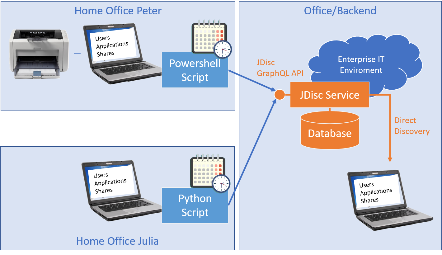 Therefore what we could do is run a local script, deployed via endpoint management solution onto the endpoints (laptops of the employees in HO), that locally discovers the few thing that are interesting and then push these to the central JDisc discovery server service when the VPN connection is up. Locally this can be determined easily and tried until one gets through without the need to run a service on the endpoint for this purpose. Again, the GraphQL upload API serves as the endpoint that is contacted by the scripts, which could be written in Powershell on Windows or Python cross-platform, whatever the office equipment allows.