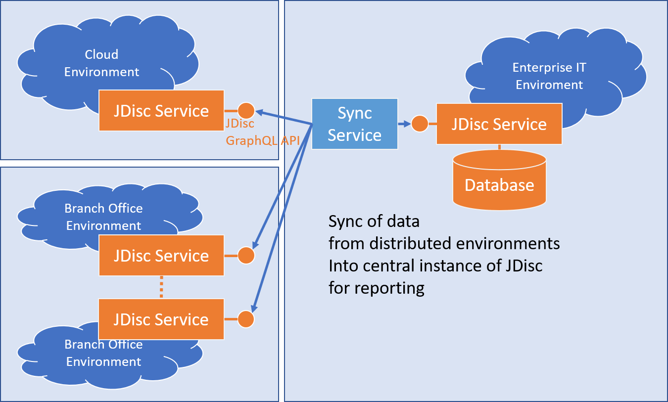 In case a customer only has JDisc Discovery in use for discovery, it still can be, that there are multiple distributed environments with separate responsibilities and IT-technically separated by firewalls and network zones. In this case one usually installs a JDisc Discovery server in each of these zone, for example a cloud environment, the enterprise IT or in each branch office in order to avoid having to discovery via VPN connections. If that sounds familiar then you might guess that it would still, for ITSM processes, be very useful to have one central instance where one can do reporting and other activities on the discovered information from all assets in the whole company and not environment by environment.