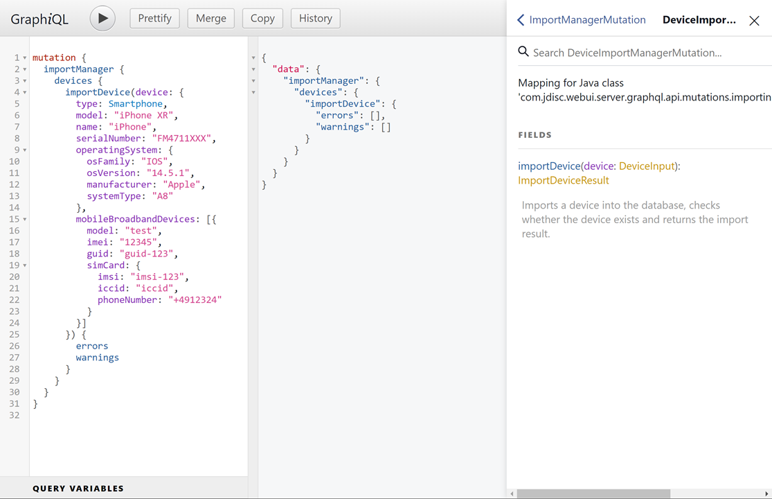 First we test this manually to see how the API is used, using the built-in GraphQL IDE in the JDisc Discovery web UI. This is an example inportManager mutation for a iPhone XR device and we see the adding has worked and no errors or warnings were returned: