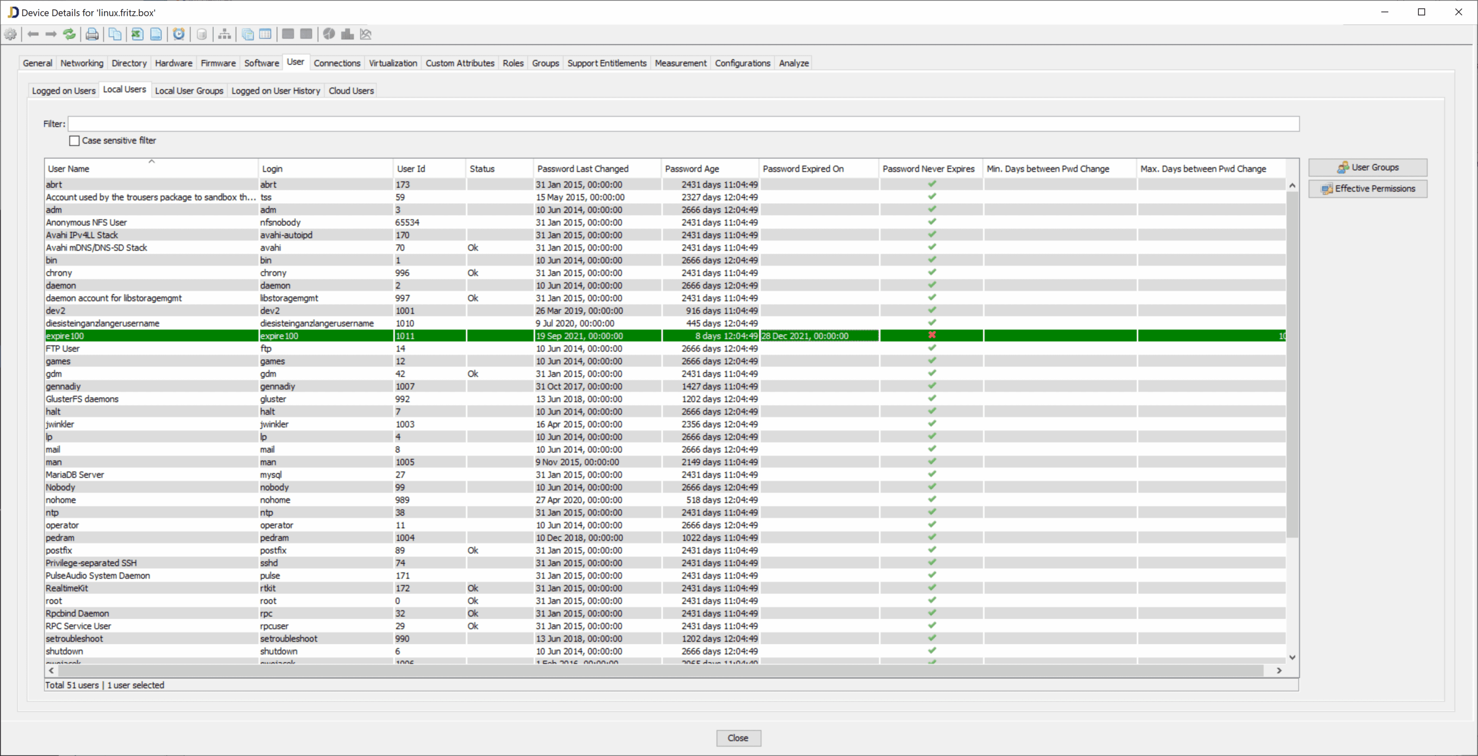 Below, you find a typical demo machine where the password age is more than 2000 days :-). And the selected account is configured to expire in December 2021.
