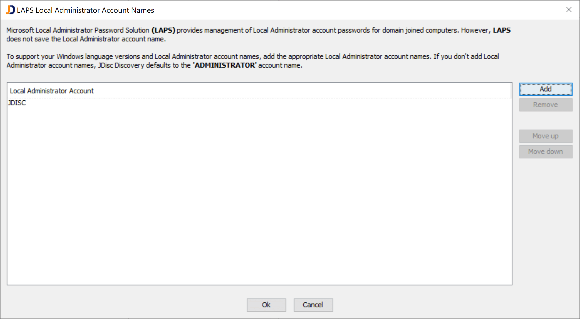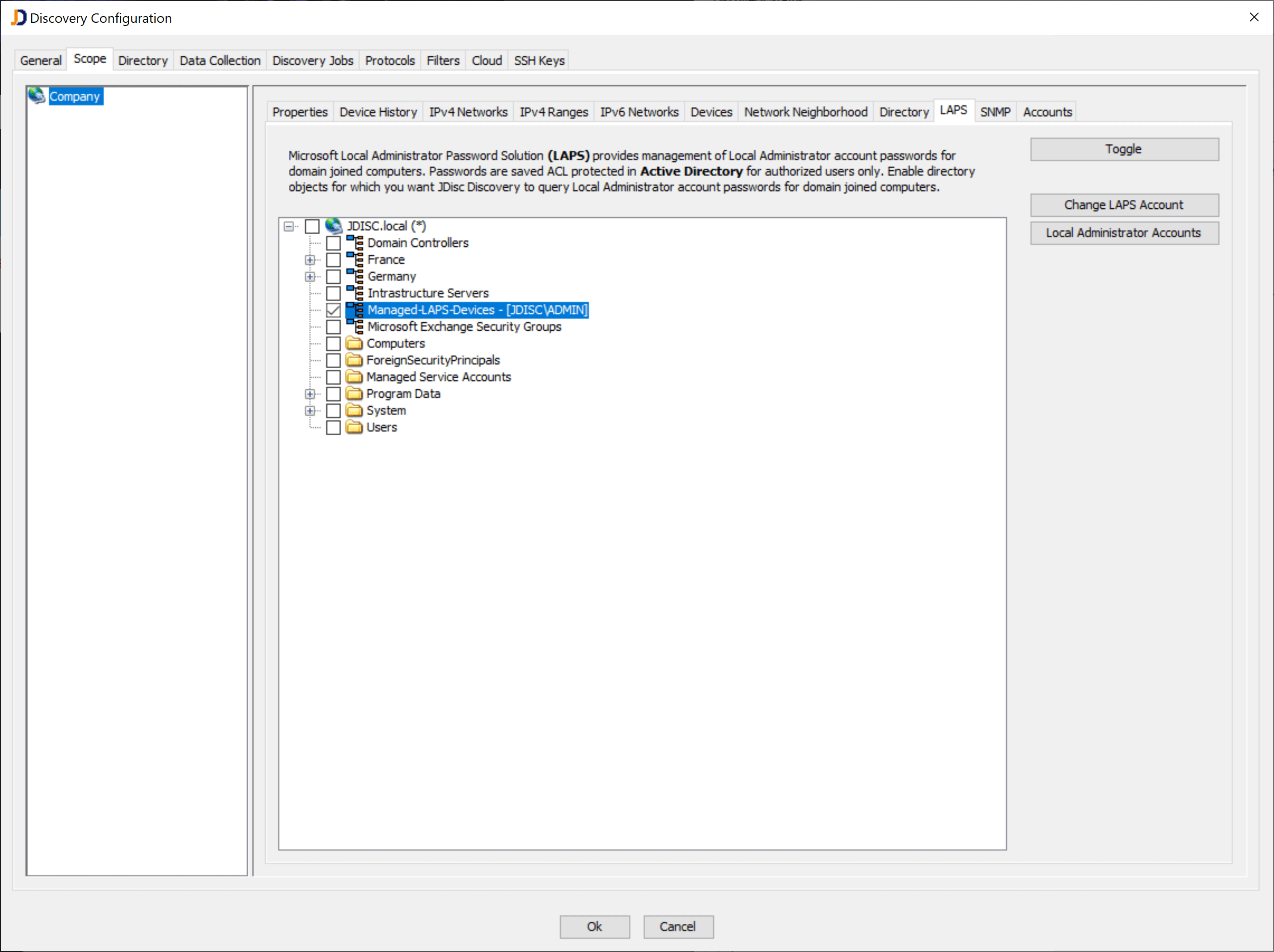 In order to configure Microsoft LAPS within JDisc Discovery, you need to tell the discovery which directory objects are configured with LAPS. Therefore, we have added a new configuration tab within the scope section in the discovery configuration dialog.