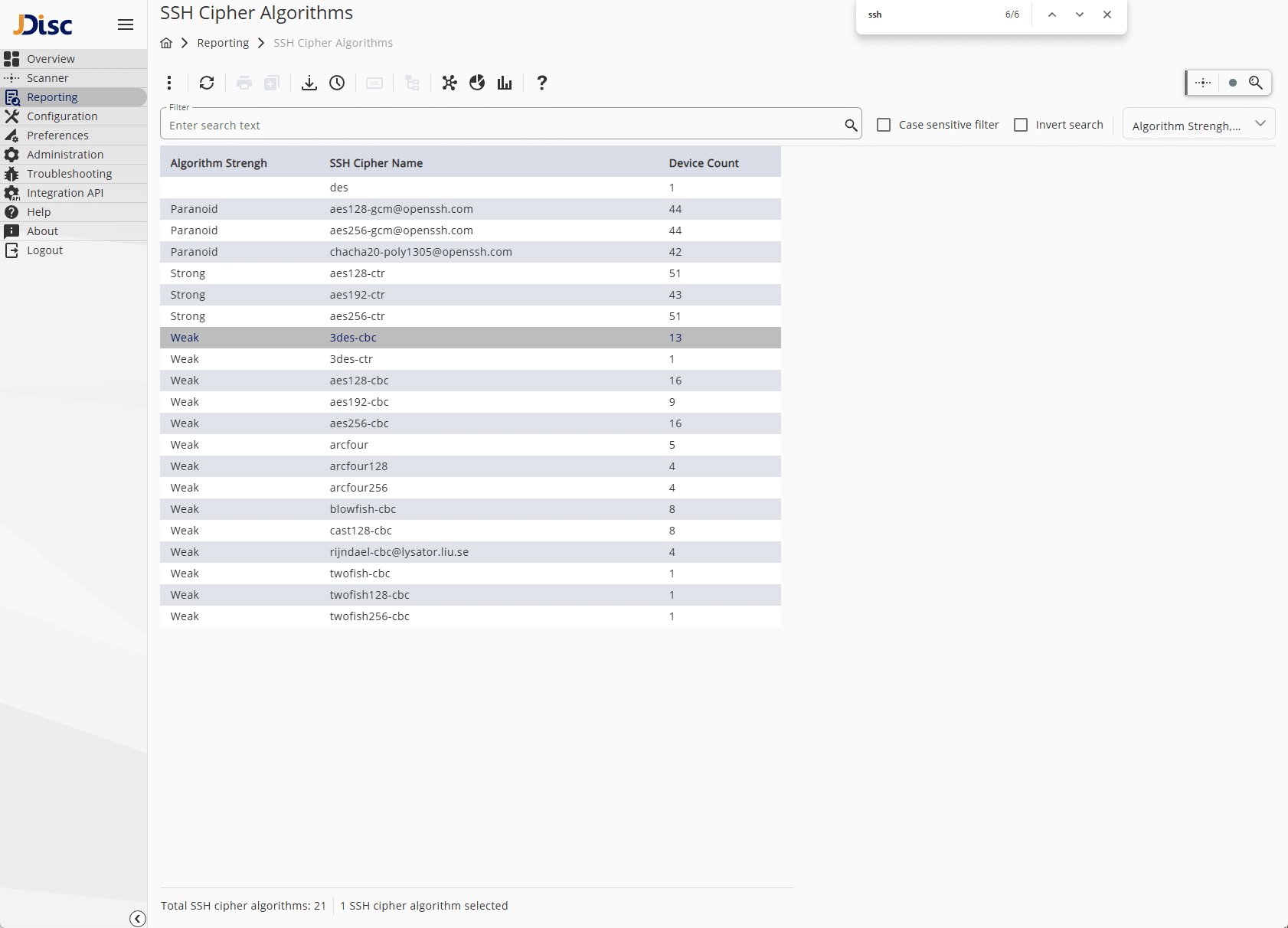 The overview report below lists all SSH cipher algorithms together with the number of devices using them.