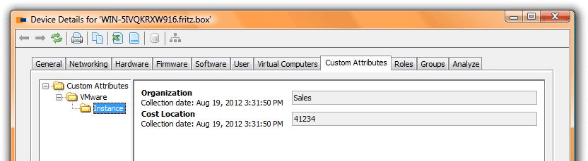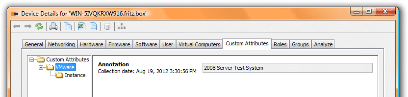 When JDisc Discovery finds the vCenter installation, then it reads all custom attributes for the active VM instances. When a custom attribute is not yet defined within JDisc Discovery, then it creates a new custom attribute within the “VMware/Instance” subtree.