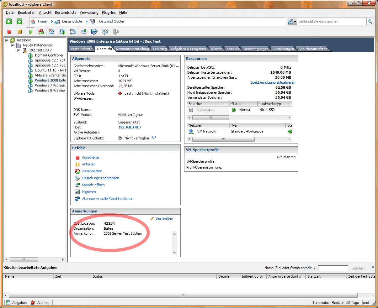 The image below illustrates how the custom attributes appear in vCenter’s overview page. The lower area of the screen (marked in red) lists the custom attributes for the selected VM. For testing purposes, we created two custom attributes: