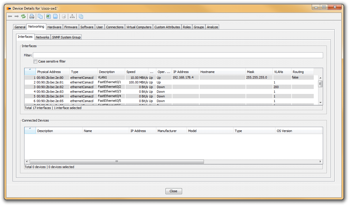 The Networking Add-On extends our core product with features specialized on network management aspects. As of today, we can already discover the network topology and collect configuration files for the most popular routers and switches. The coming release (JDisc Discovery 2.9) will collect information about VLANs and how switch ports are assigned to them.