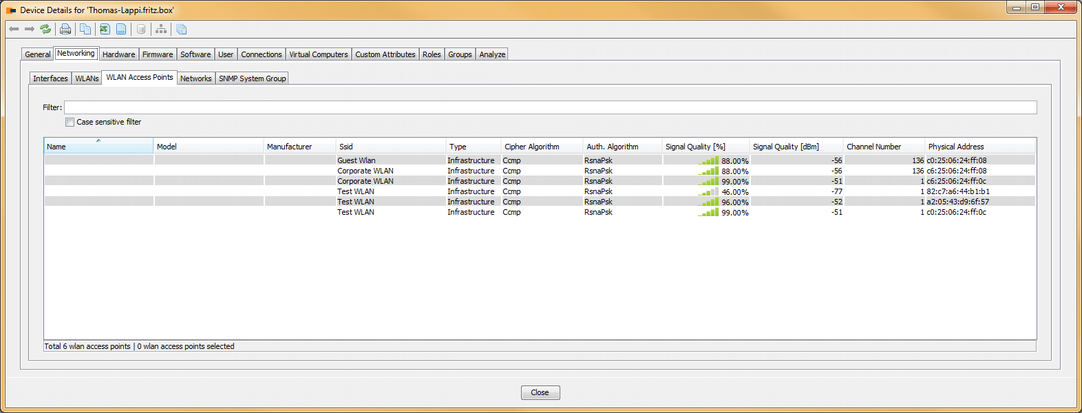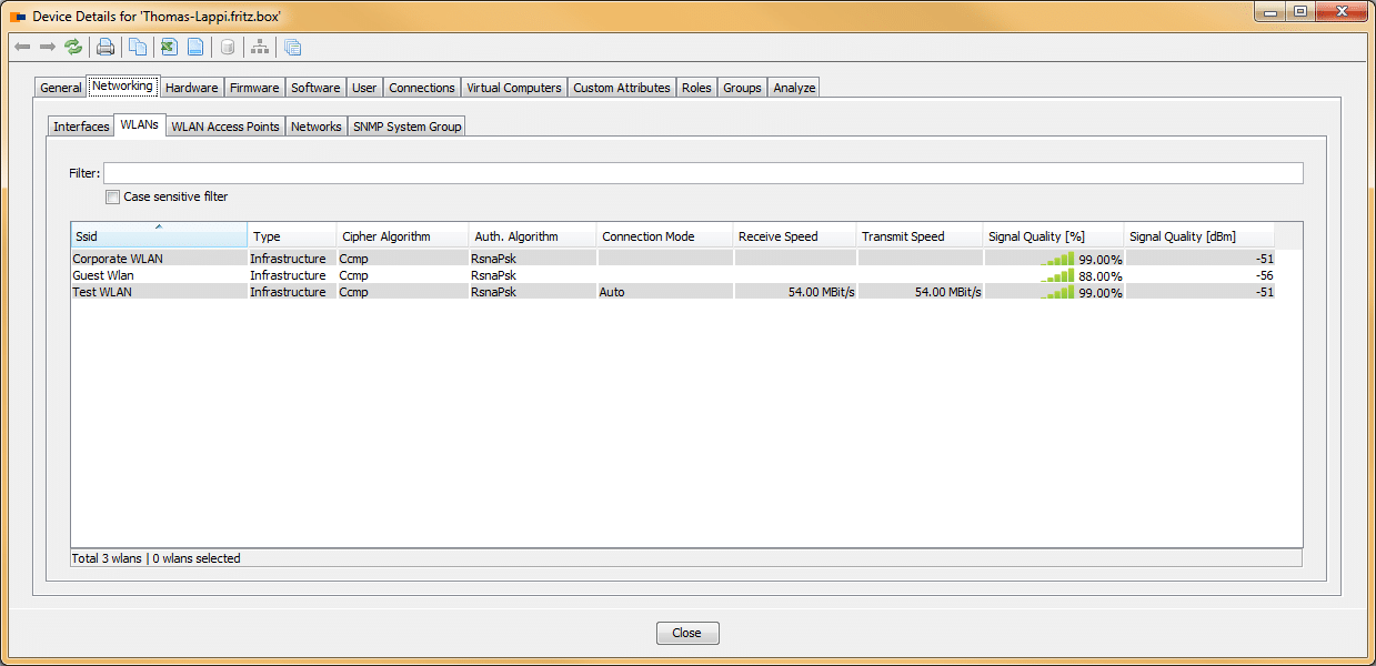 All that sounds not too complicated and one might think that this is just some basic WMI information provided by each Windows computer. However it turned out, that WMI provides classes for this information, but this information is rarely populated by the WLAN network driver. That’s again when our remote login agent for Windows comes into play. Our remote login agent gets deployed for the duration of the scan and allows the execution of commands locally on the target device. That lets us collect information that is not exposed by standard protocols such as SNMP or WMI.