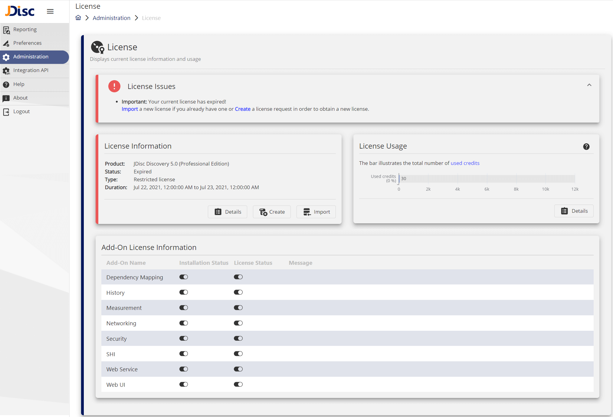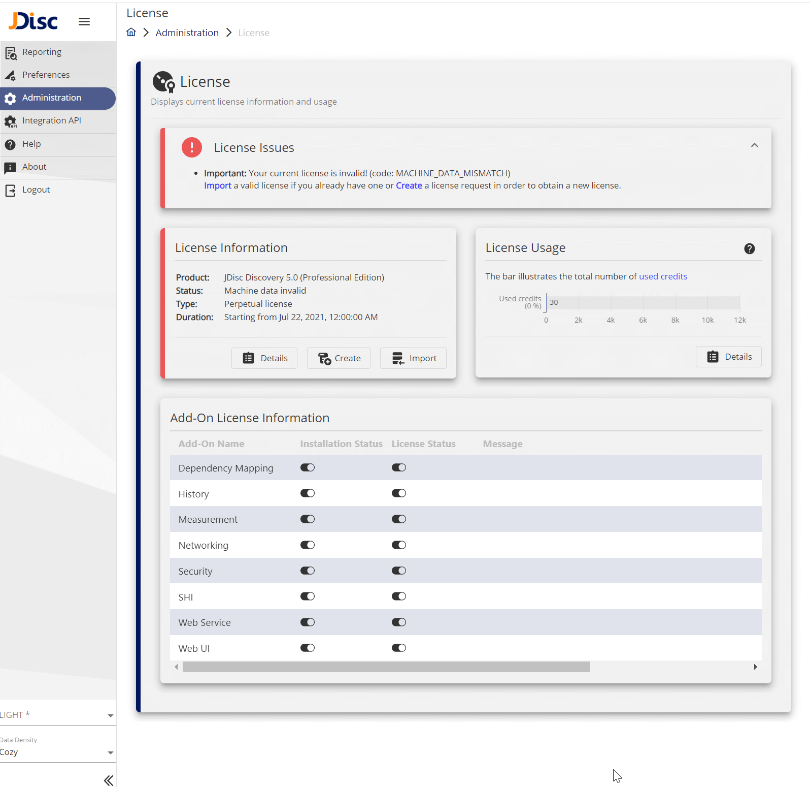 In certain cases, for example, when the license is expired, you run out of credits, or the JDisc Discovery server hardware has significantly changed, etc., the installed license is not valid anymore. Such problems will appear on top of the license management UI. Let’s go through the most common errors.