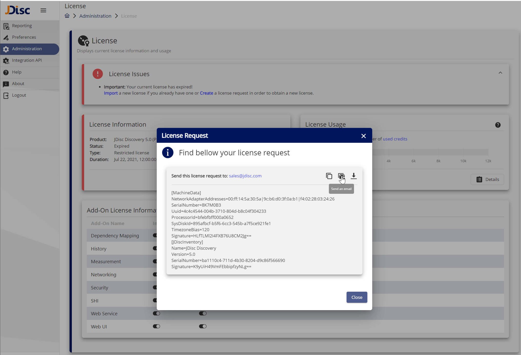 In order to obtain a new license, we always need some information related to the JDisc Discovery product installed, as well as the machine where the product is installed. Such information is automatically gathered by our product and bundled in a so-called license request.