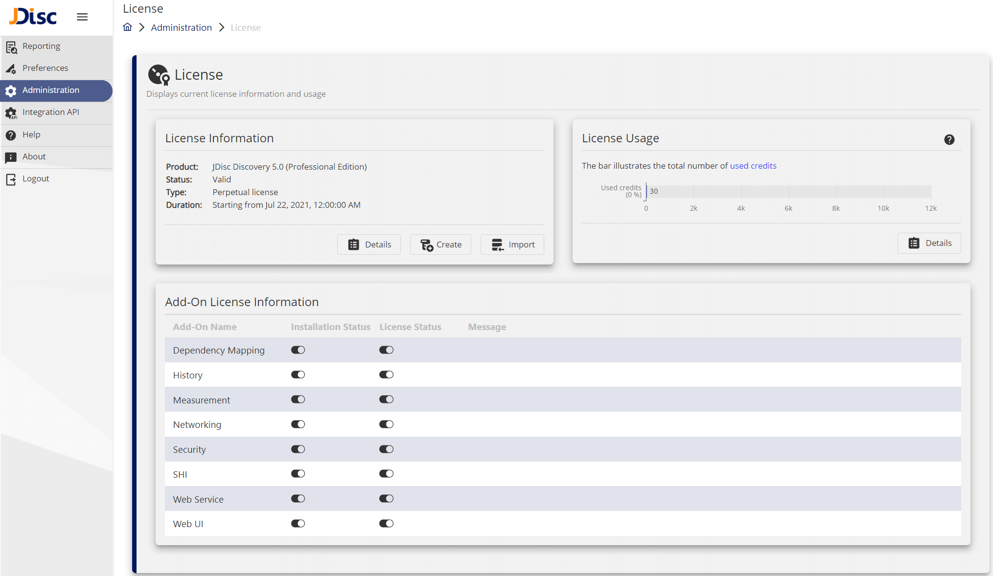 - The second section “License Usage” provides you with information like the number of your available credits and the current usage. If needed, you can view more license usage details by clicking on the Details button in this section.