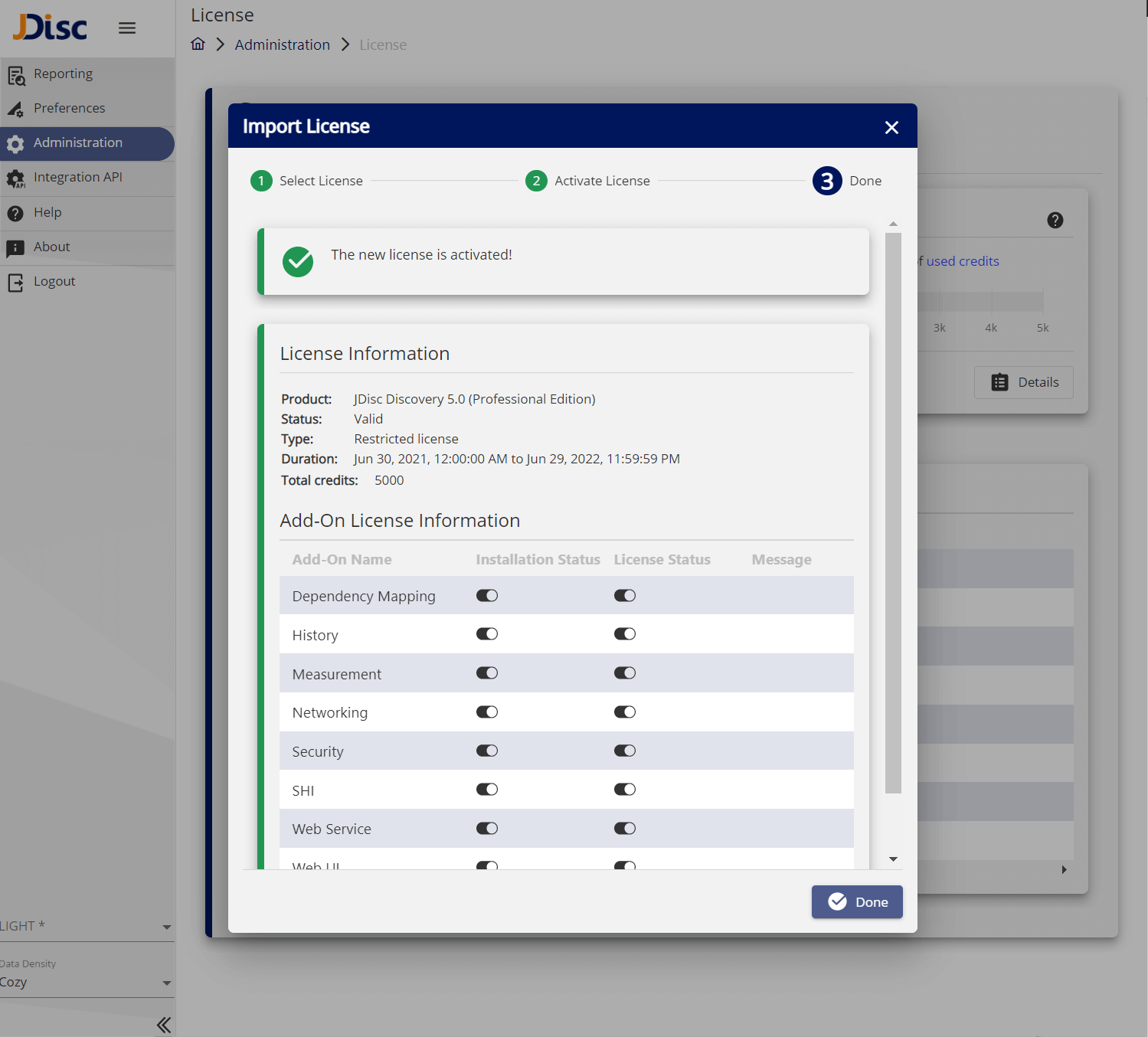 Finally, your new license is active. You can close this wizard by clicking on the Done button.