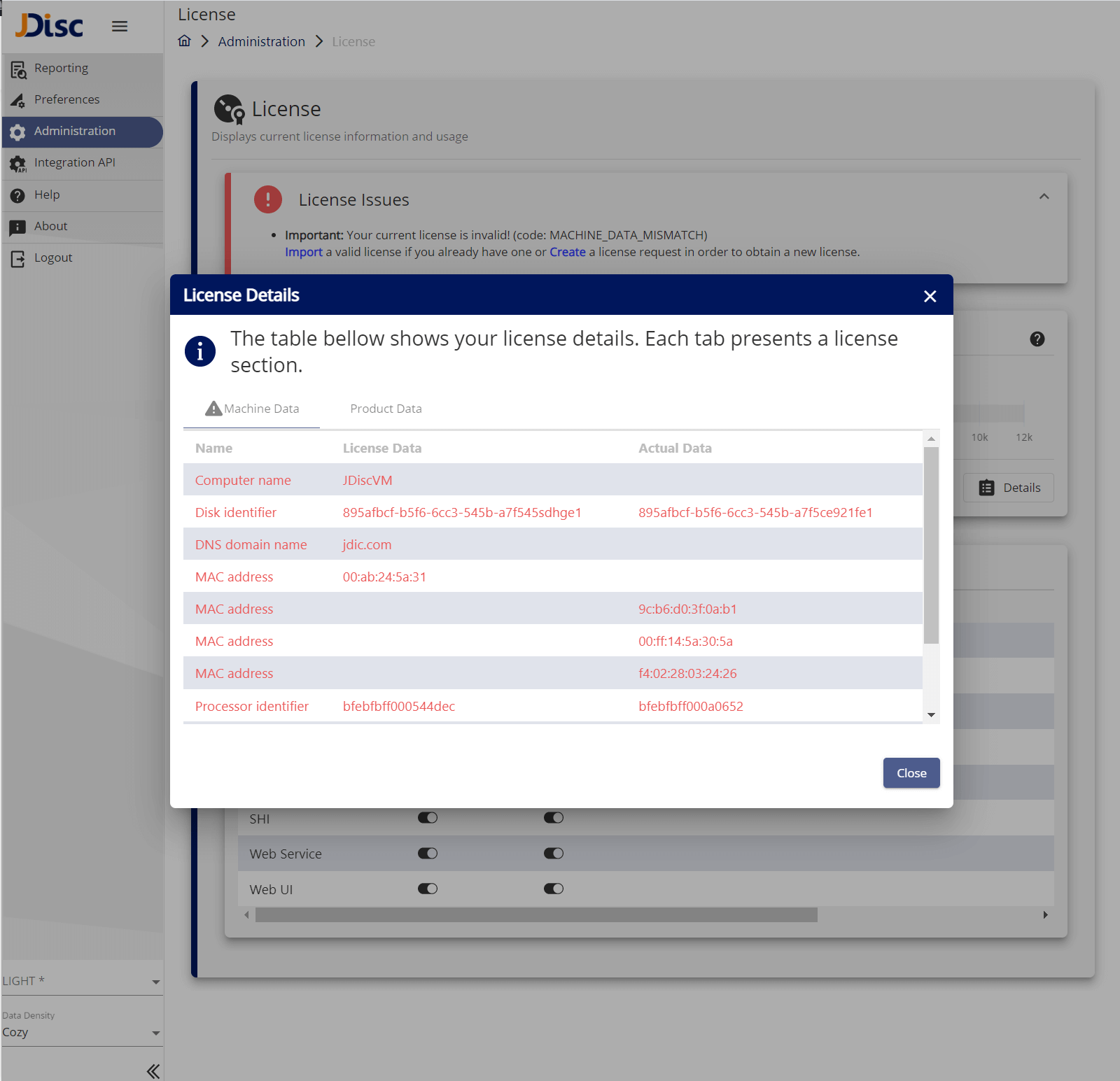 JDisc Discovery server continuously validates your license. In the License Management UI, notifications will appear when something is not ok with your license.