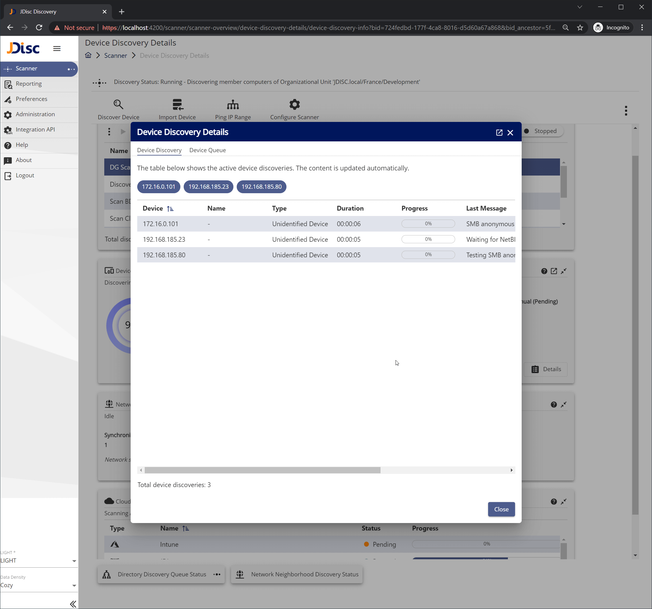 The scanner dashboard is designed to give you an overview of the discovery process. At the same time, it acts as a starting point for deep dives on details. Several dashboard items provide detail views. For instance, in the device discovery status details you can find the actual progress of each device IP that is being discovered and the device discovery queue (Figure 5.1). Likewise, you can drill down to ping discovery status details (Figure 5.2), network neighborhood discovery status details and directory discovery status details. In future releases, additional detailed views will be added.