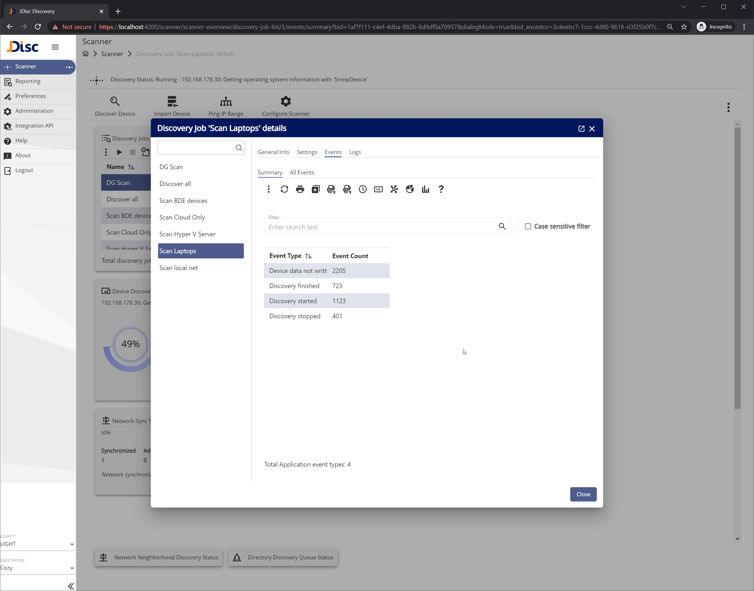 From the discovery job details dialog, you can navigate to the discovery events summary tab (Figure 3.3.1) or to the discovery all events tab (Figure 3.3.2), in order to get an overview of what type of events the discovery job generates, and – if necessary – list all of them. This view is used frequently during troubleshooting.